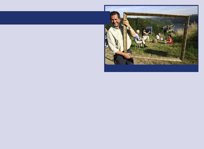 Das Rheintal wie gemalt: Auf den Spuren alter Meister können Hobby-Maler jetzt wieder an den romantischsten Plätzen im UNESCO Welterbe die Staffelei aufstellen. Thomas Hahlbrock (links) hat gemeinsam mit Künstlern die schönsten Blickpunkte der berühmtesten Landschaftsmaler des 19. Jahrhunderts im deutschen Grand Canyon zwischen Koblenz und Bingen wiederentdeckt. Vorgestellt werden die atemberaubendsten Ausblicke im neuen Freizeitführer „Ein schöner Tag: Welterbe Rheintal“. 111 Tipps für Touren führen zur Burgen und Bauten, zu Mythen und Museen rund um die Loreley, dem bekanntesten Schieferfelsen der Welt. Verzaubert von der bizarren Flusslandschaft mit ihren steil abfallenden Felsen und trutzigen Burgen legten die großen Landschaftsmaler Caspar Scheuren, William Turner und William Tombleson mit ihren Bildern den Grundstein für den Rheintourismus. Heute erlebt das Tal der Römer, Ritter und Romantiker eine Renaissance. Einen der schönsten Rheinblicke haben Besucher auf dem Patersberg bei St. Goarshausen: Den Fluss zu Füssen, die Burg Katz im Blick und den Loreleyfelsen als Facette im Hintergrund |